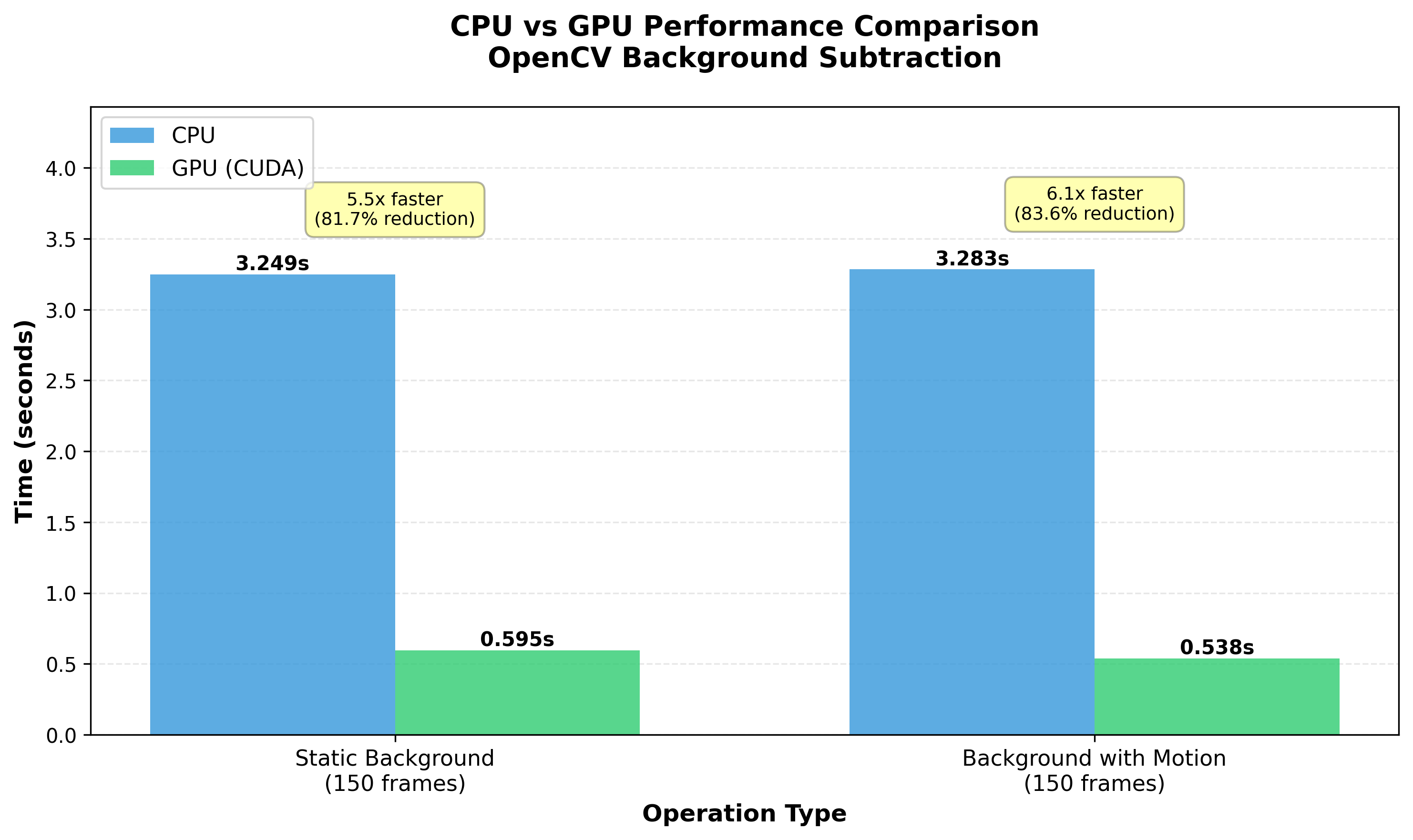 The GPU version is consistently 5-6x faster than CPU, even with the overhead of uploading frames to GPU memory and downloading results back to CPU. This speedup means you could process 6 video streams on the GPU in the same time it takes to process 1 stream on the CPU. A game changer for multi-camera applications.