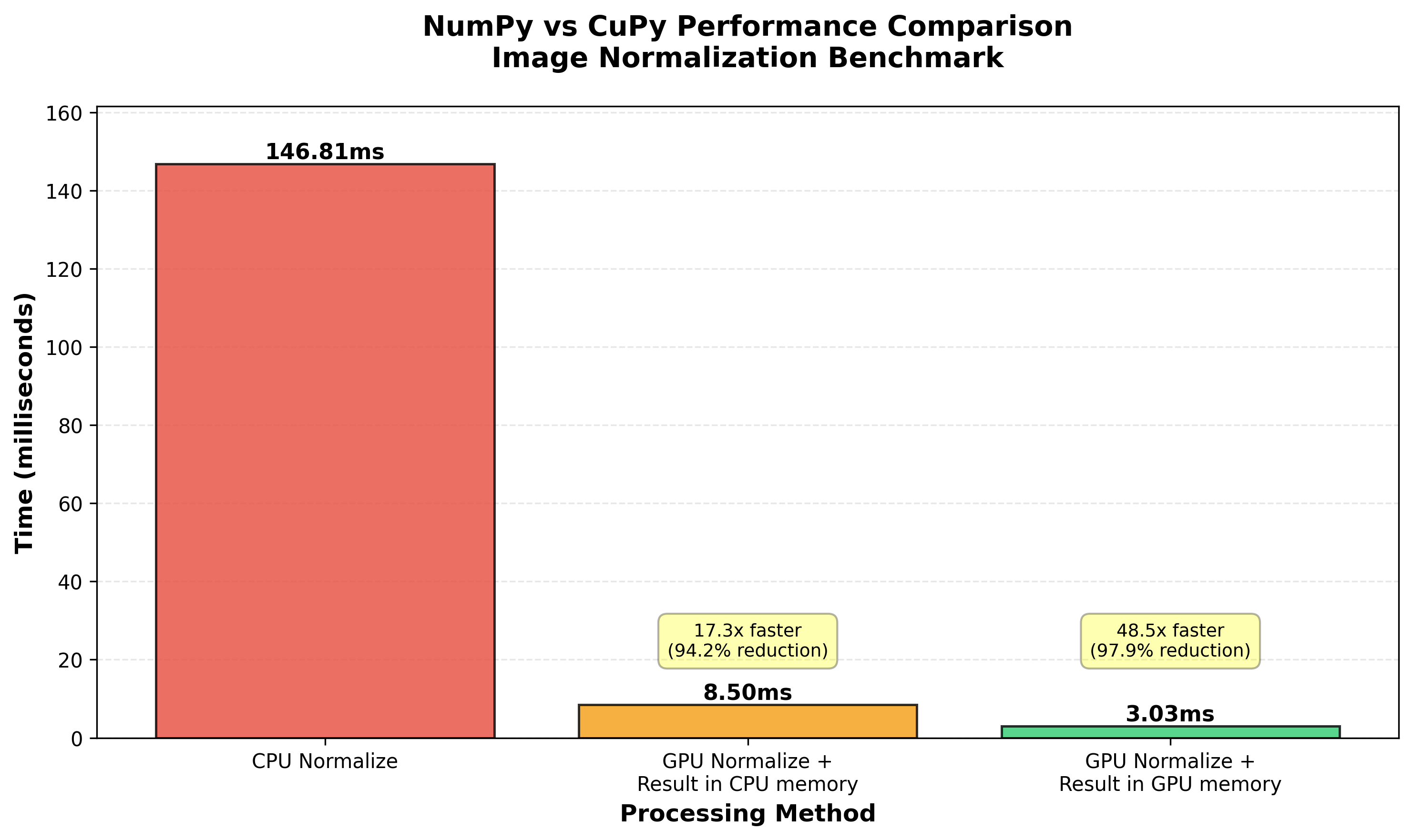 This benchmark highlights why keeping data on the GPU throughout your pipeline is crucial. If your next operation can also run on the GPU (like feeding normalized images into a GPU-based inference engine), you can achieve massive speedups by avoiding memory transfers entirely.